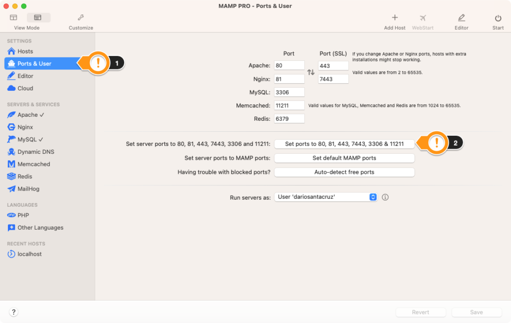 Asegúrate que “Run servers as:” tenga activado tu usuario.