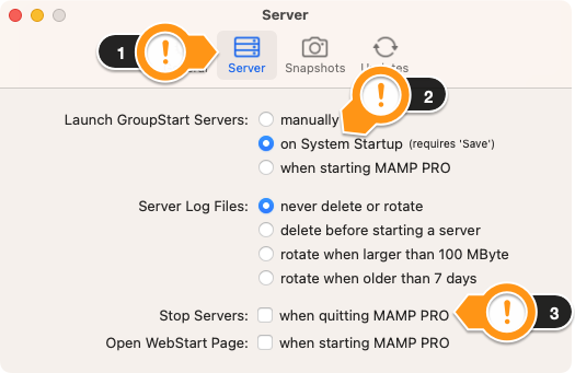 Navega a la pestaña Server y cambia el inicio de los servidores a “on System Startup” y desactiva “Stop Servers: when quitting MAMP Pro”. Así no tiene que estar abierta la ventana todo el tiempo y podemos accesar a los programas desde la terminal cuando sea.