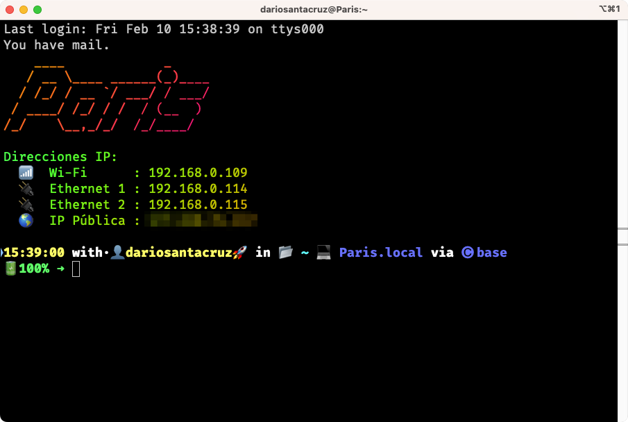 ./.oh-my-zsh/custom/inicio.shEsto puede aumentar un par de segundos el tiempo que tarda en iniciar la terminal. Esto es especialmente por el comando figlet. Puedes sustituirlo por texto o removerlo si quieres. Para mi es útil pues puedo compartir los mismos ajustes en todas mis computadoras y cada una se ajusta a decir su nombre, sin embargo mi laptop tiene 2 adaptadores de Ethernet (uno que viene con el adaptador de USB, HDMI y lector de memorias que no es gigabit pero es práctico y uno Gigabit que es el principal, entonces de todas maneras es necesario cambiar la dirección de los adaptadores, pero es suficiente.