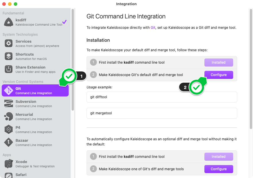 Se puede usar Kaleidoscope para comparar múltiples archivos de texto, folders e imagenes. Es una app de paga, algo cara que si no fuese porque tengo una licencia desde hace años probablemente prescindiría de ella… creo… tal vez no, es muy útil. Se puede configurar para que sea el DIFF editor de GIT así como hacer que sea posible comparar 2 archivos desde la terminal.