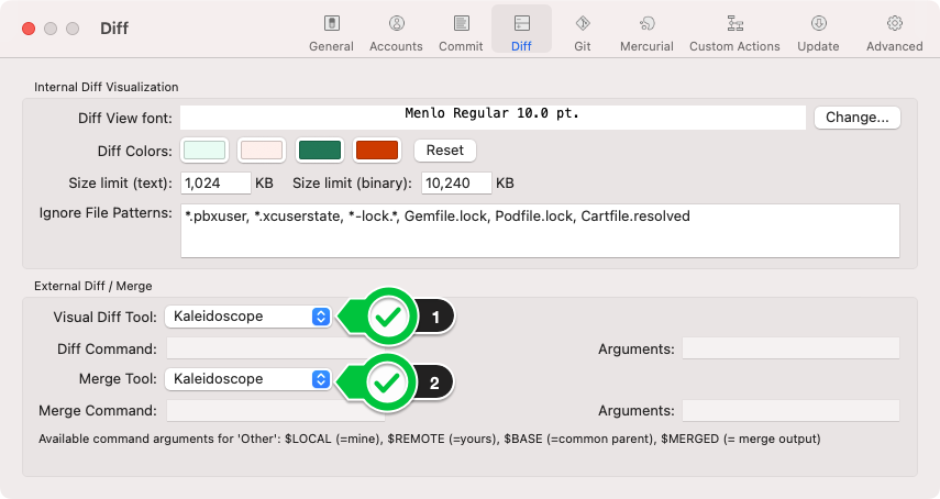 alias stree="/Applications/SourceTree.app/Contents/Resources/stree"Abre las configuraciones con CMD + , y navega a la pestaña DIFF.
