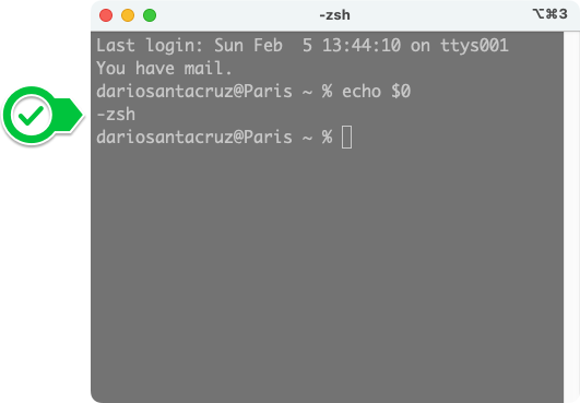 Para identificar que la terminal que estás usando es efectivamente ZSH ejecuta el comando echo $0 la respuesta en caso de que sea ZSH deberá ser -zsh.