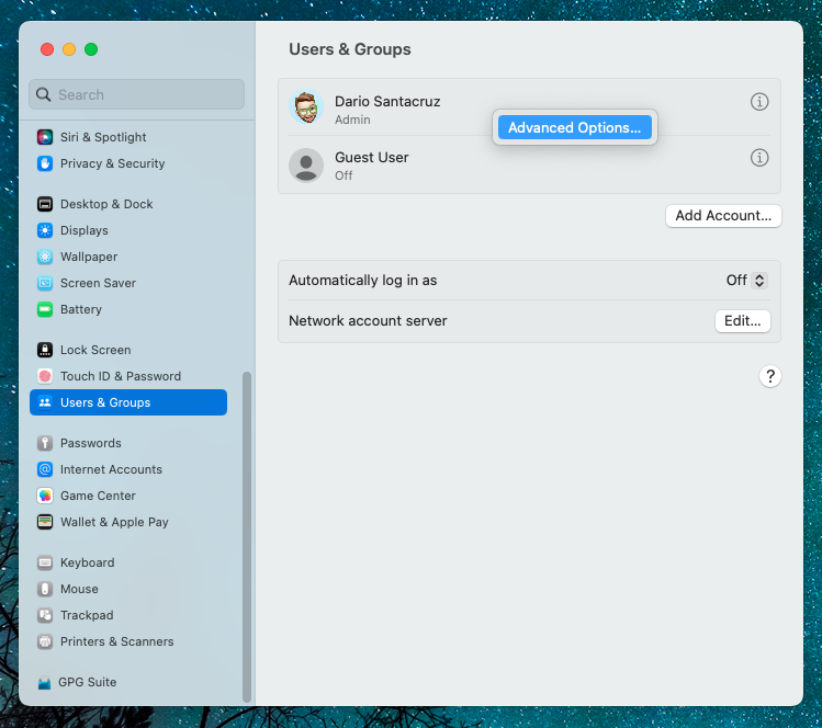 En caso de que no sea esta la respuesta en MacOS desde el panel de configuraciones de usuario haz clic derecho en tu usuario y selecciona Opciones Avanzadas.